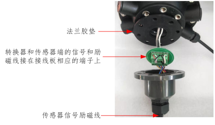 第三步: 将转换器底座端加法兰胶垫,并将处理好的信号线和励磁线从接 线板中间孔穿出来后接到接线板的对应端子上。传感器的信号和励磁线接在线板 另一端相应端子上;