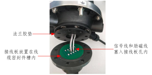第四步: 将转换器端的信号线和励磁线塞入接线板孔内,并将接线板放置在